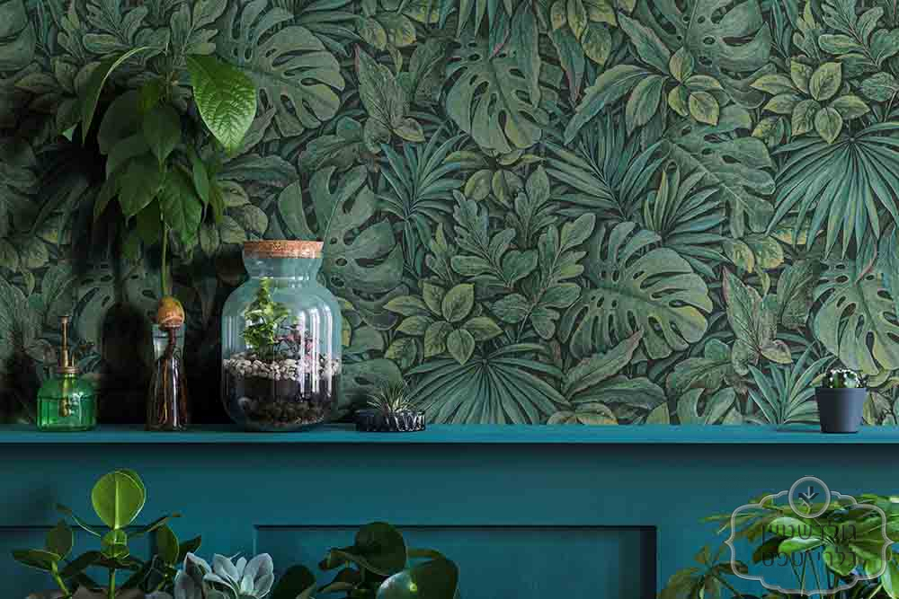 טפט בוטני תלת מימד, עלים טרופיים בגווני ירוק על רקע אפור פחם