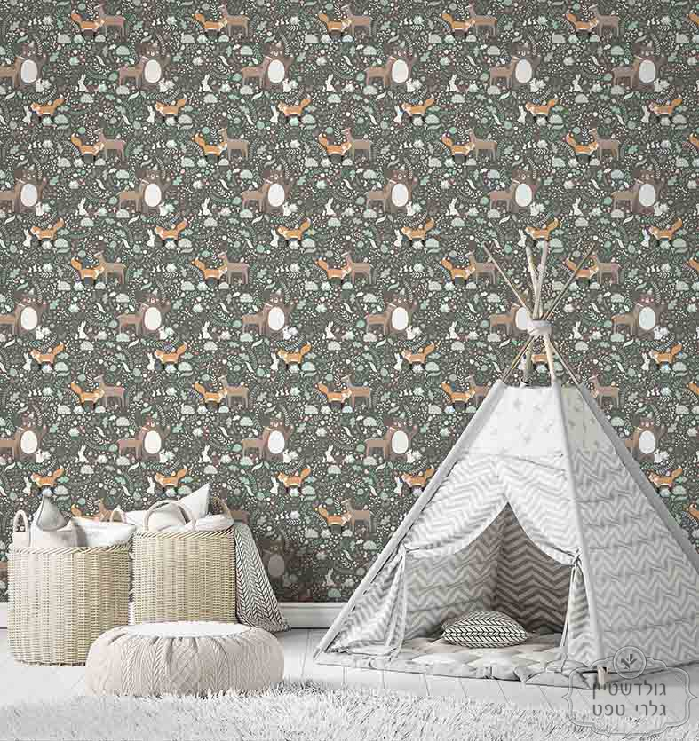 טפט לחדר ילדים, ABC וחיות בגווני אפור על רקע לבן שמנת