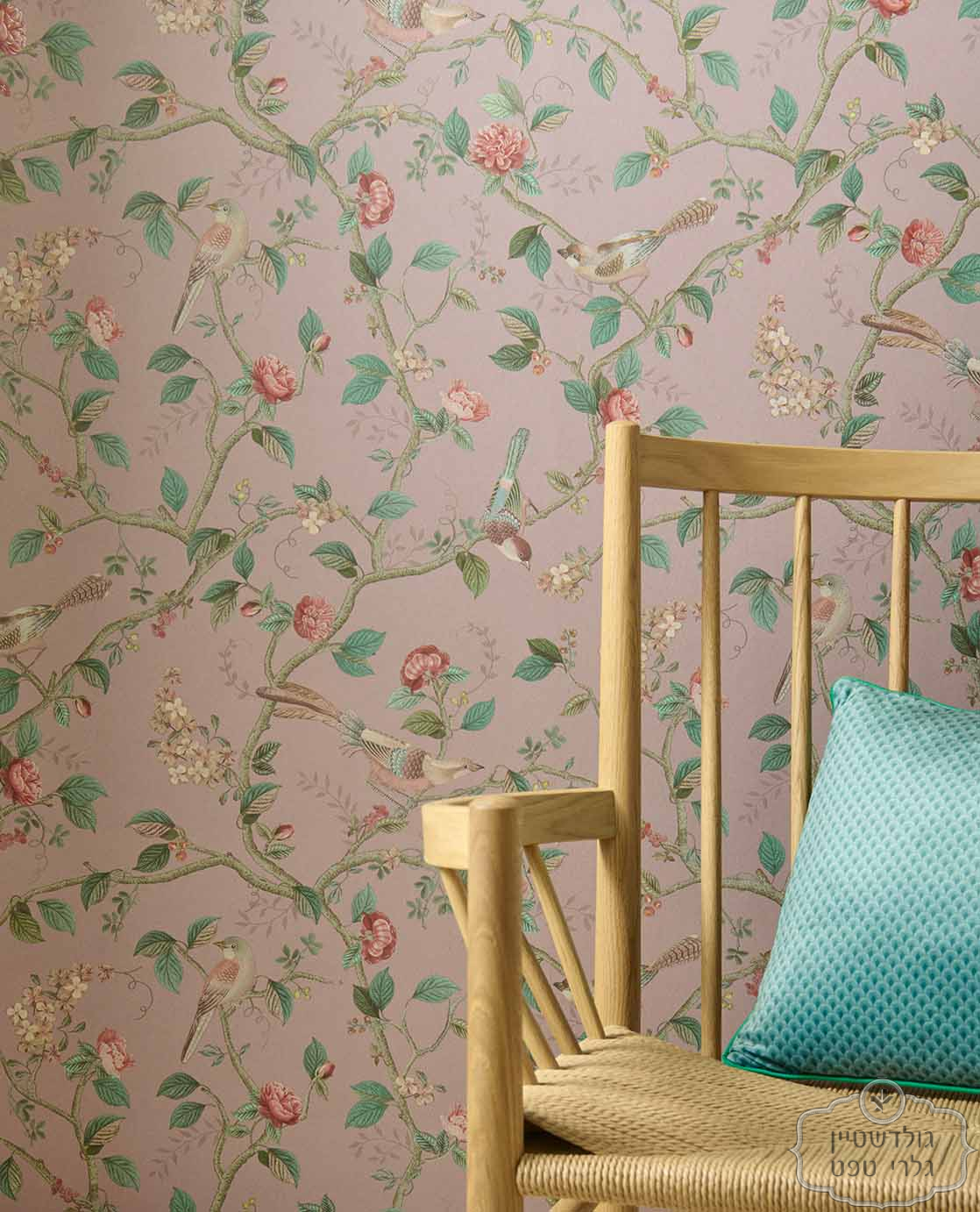 טפט פיפ ציפורים על עץ, עלים ופרחים על רקע סגול לבנדר