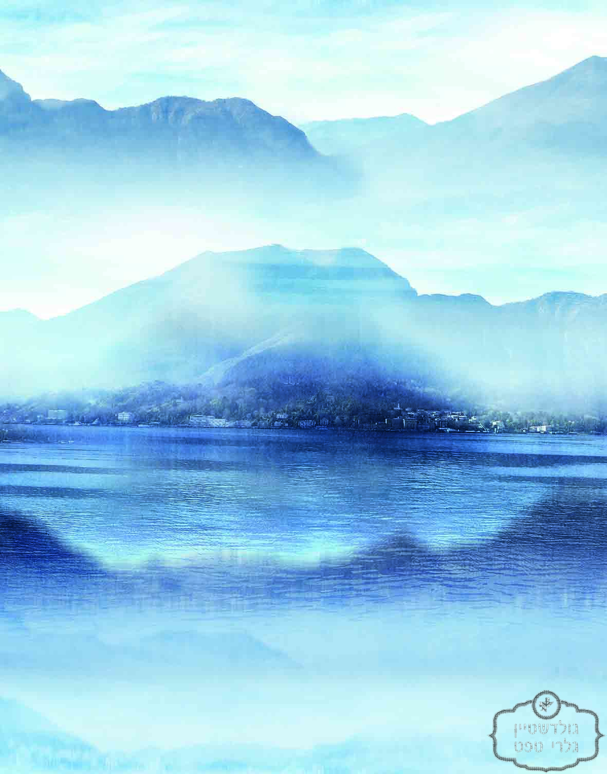 תמונת טפט עשוי ויניל, איכותי, נוף עיר חוף בין הים וההרים והשמים, בגווני תכלת