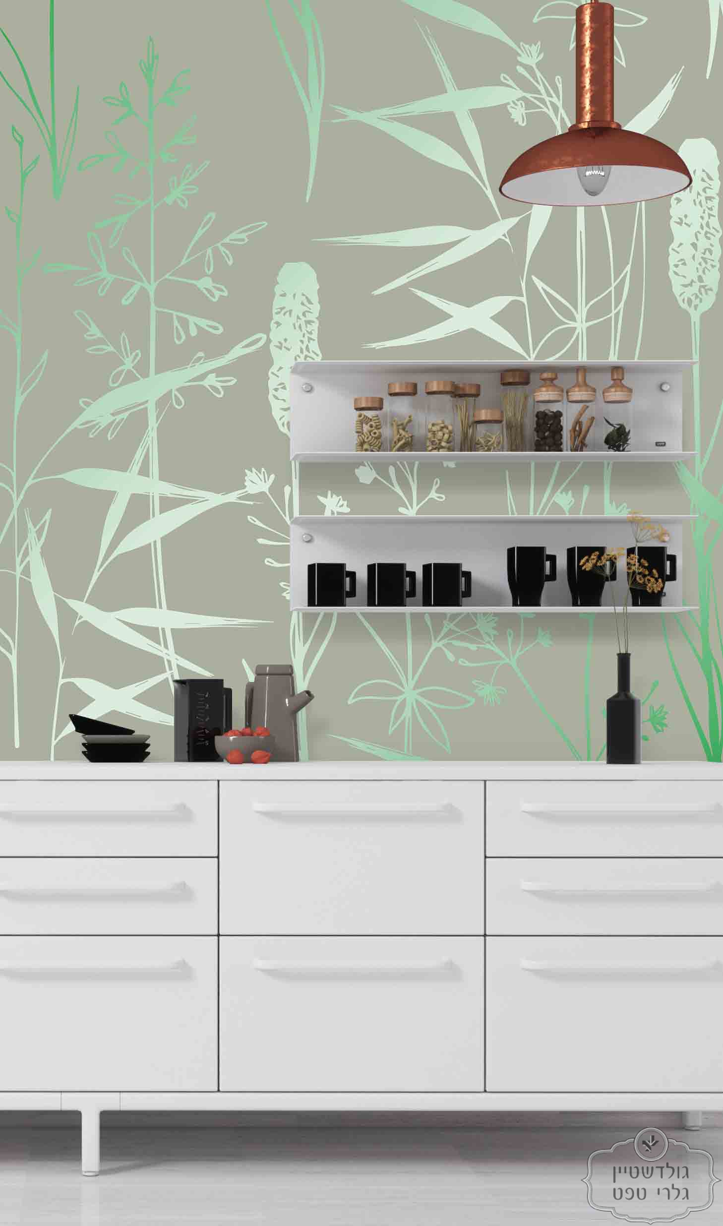 תמונת טפט קני סוף וצמחים אסיאתים על רקע ירוק מרווה